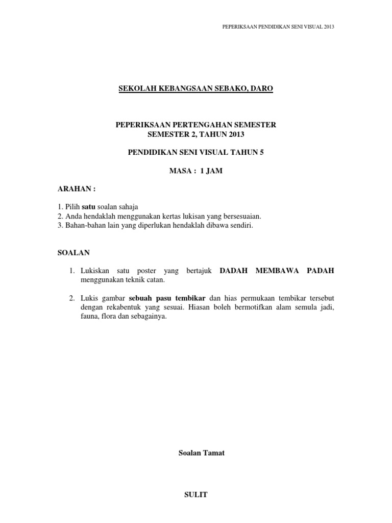 Unduh sebagai DOCX PDF TXT atau baca online dari Scribd. Soalan contoh - View presentation slides online. Seni visual adalah satu warisan khazanah kerana ia adalah artifak seni dan dokumentasi sejarah yang boleh dirujuk kemudian hari.