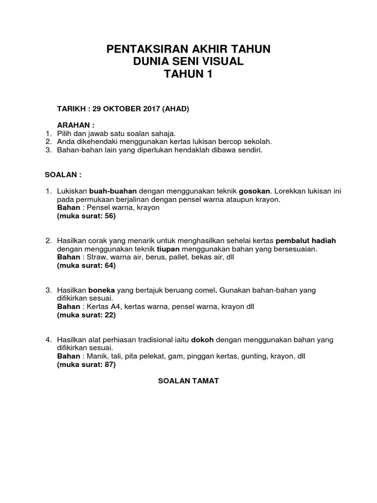Soalan Latihan Dunia Seni Visual Tahun 2 Soalan Latihan Dunia Seni Visual Tahun 2. Gubahan motif seni sulaman banyak menggunakan bahasa seni. Scribd è il più grande sito di social reading e publishing al mondo.